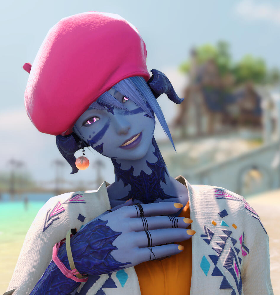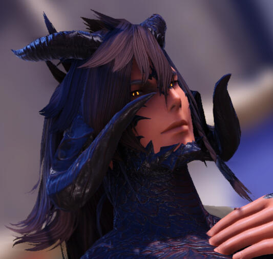 HEIGHT 5’6” HAIR Short, Bangs, Navy Blue EYES Purple Iris, Pink Limbal Rings RACE/ETHNICITY Au Ra (Xaela) NATIONALITY Ishgardian PIERCINGS None PHYSICAL DISABILITIES & CHRONIC AILMENTS Aetheric Imbalance (Umbral)